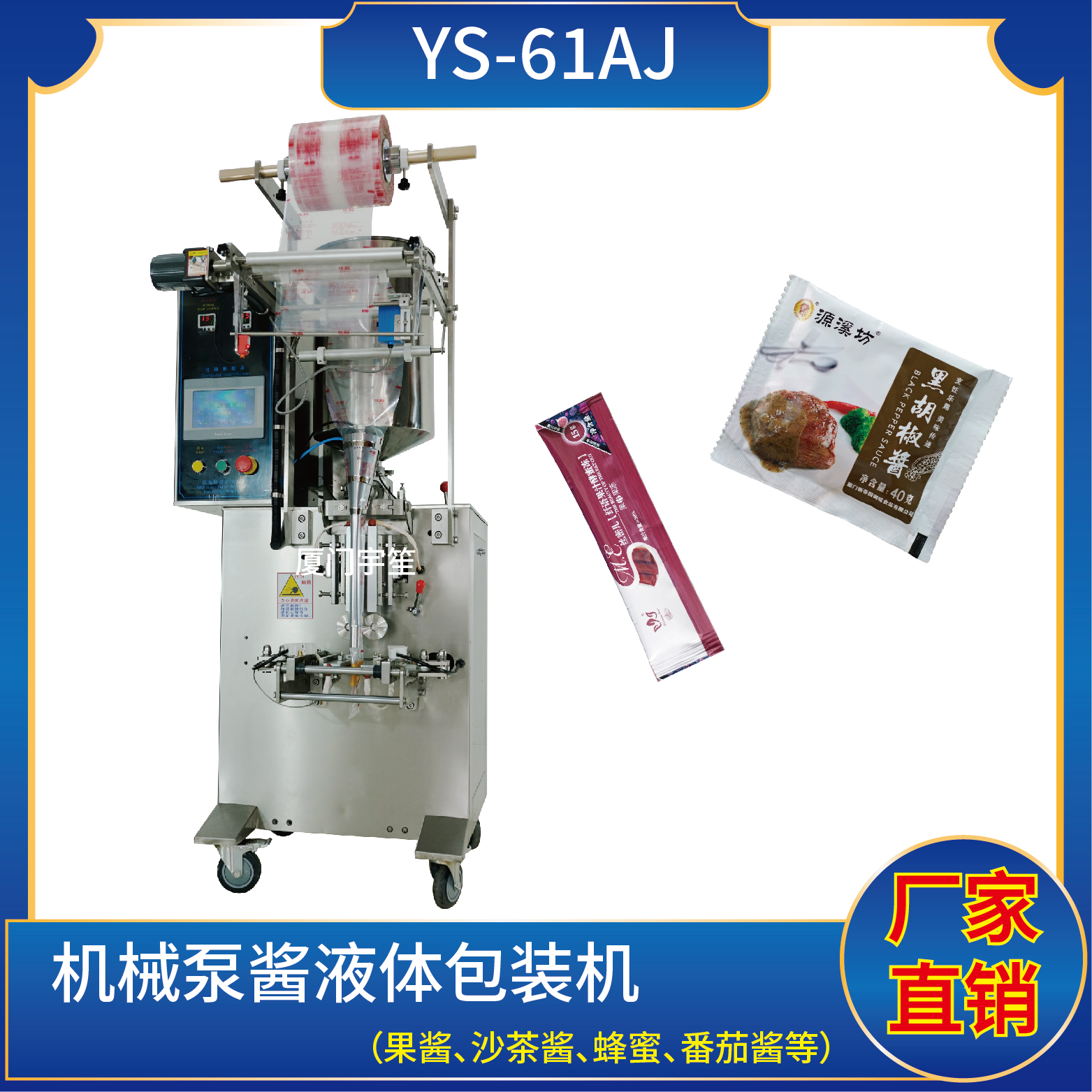 1、適用于食品、醫(yī)藥、化工、化妝品行業(yè)中液體、醬料物品的計(jì)量包裝,如:番茄醬、辣椒醬、黑胡椒醬、貓條等。